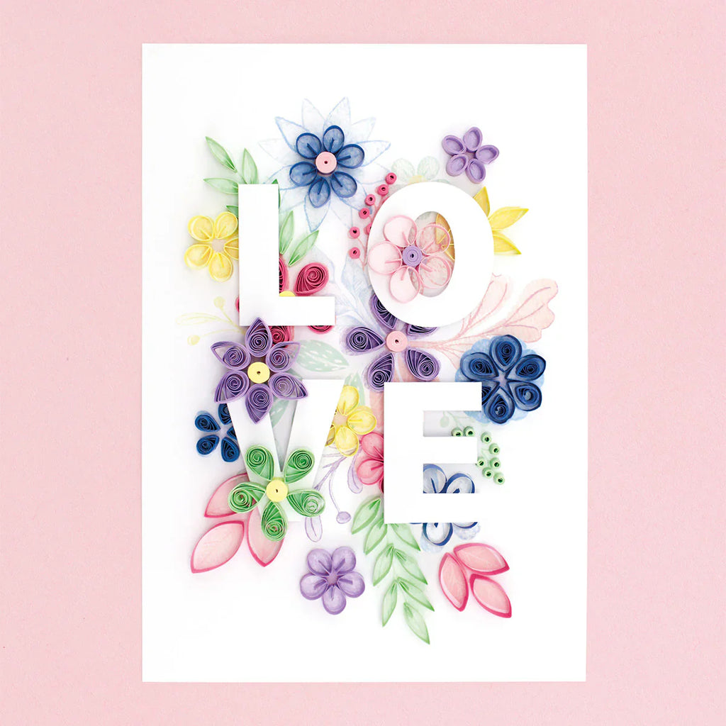 Create a beautiful layered quilling paper art with this kit, which features a bespoke pack of coloured 5mm quilling strips, die-cut letters spelling LOVE, and a pretty printed background that forms a guide for positioning the floral elements you will learn to make. Also included is a comprehensive full-colour instruction booklet, plus online access to the how-to videos for quilling techniques shown in the kit.
